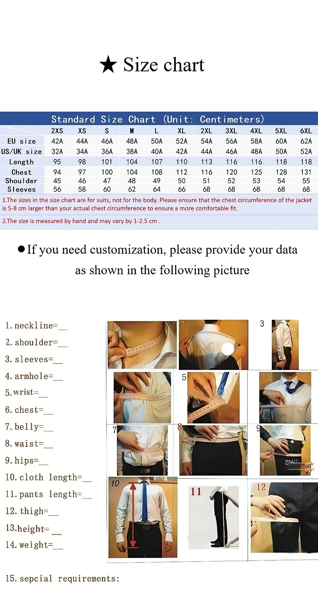 2.Size selection: Please choose the closest size based on chest and waist measurements, and refer to the size chart. Please ensure that the chest circumference of the blazer is 2-3 cm larger than the actual chest circumference, so that you can wear it more comfortably. If you are unsure, please let us know your height, weight, chest and waist measurements, and we will recommend the most suitable size for you.