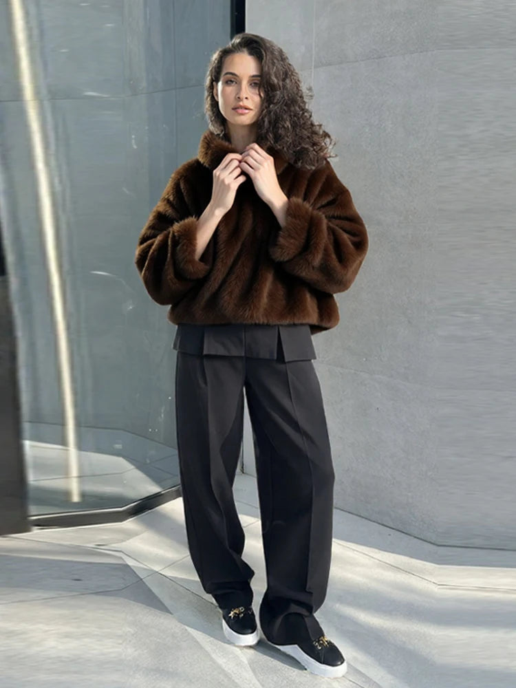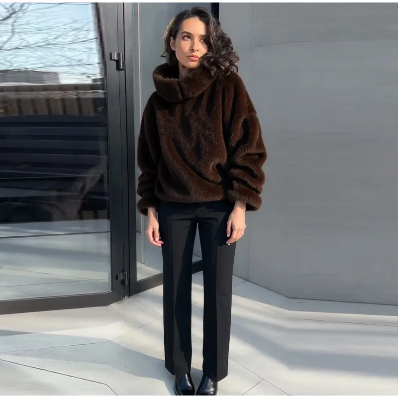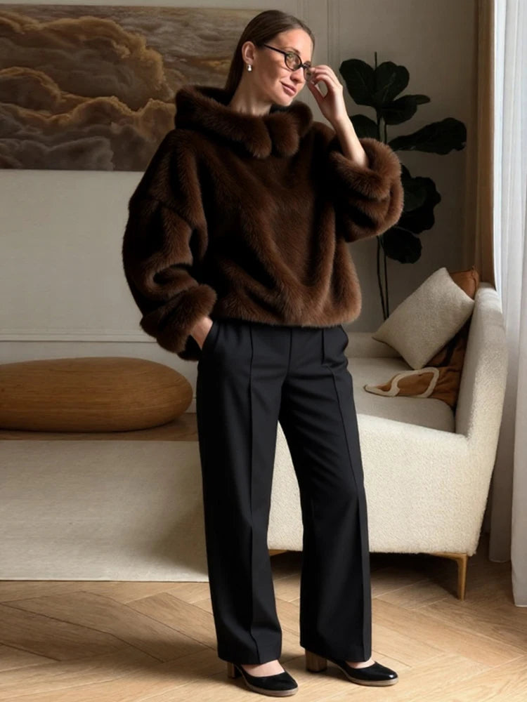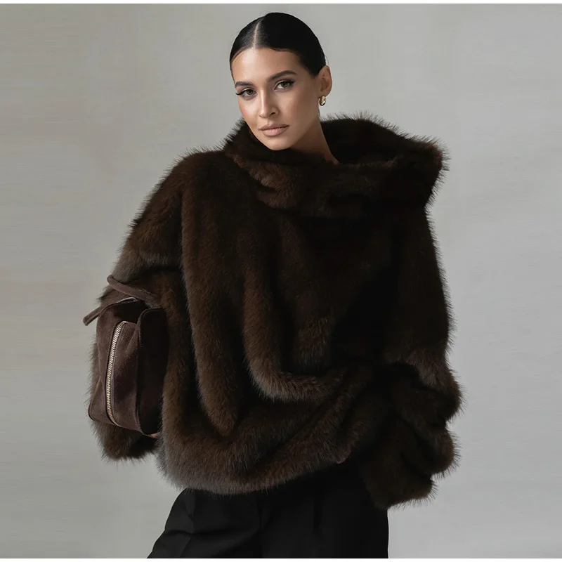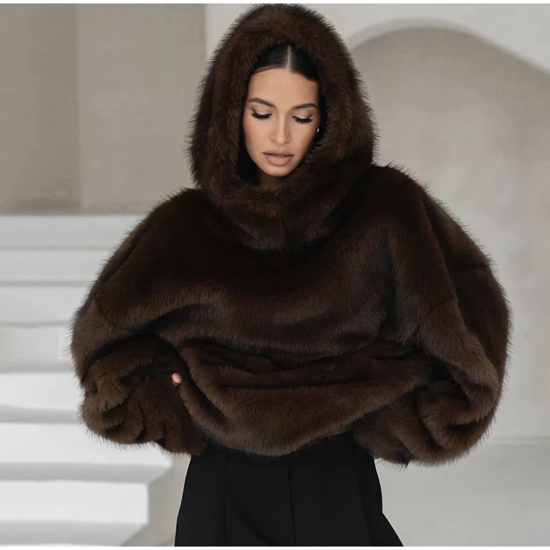 Fashion Furry Hooded Faux Fur Coats Women's Loose Long Sleeve Brown Warm Pullovers 2025 Autumn Winter Lady Casual Outwear