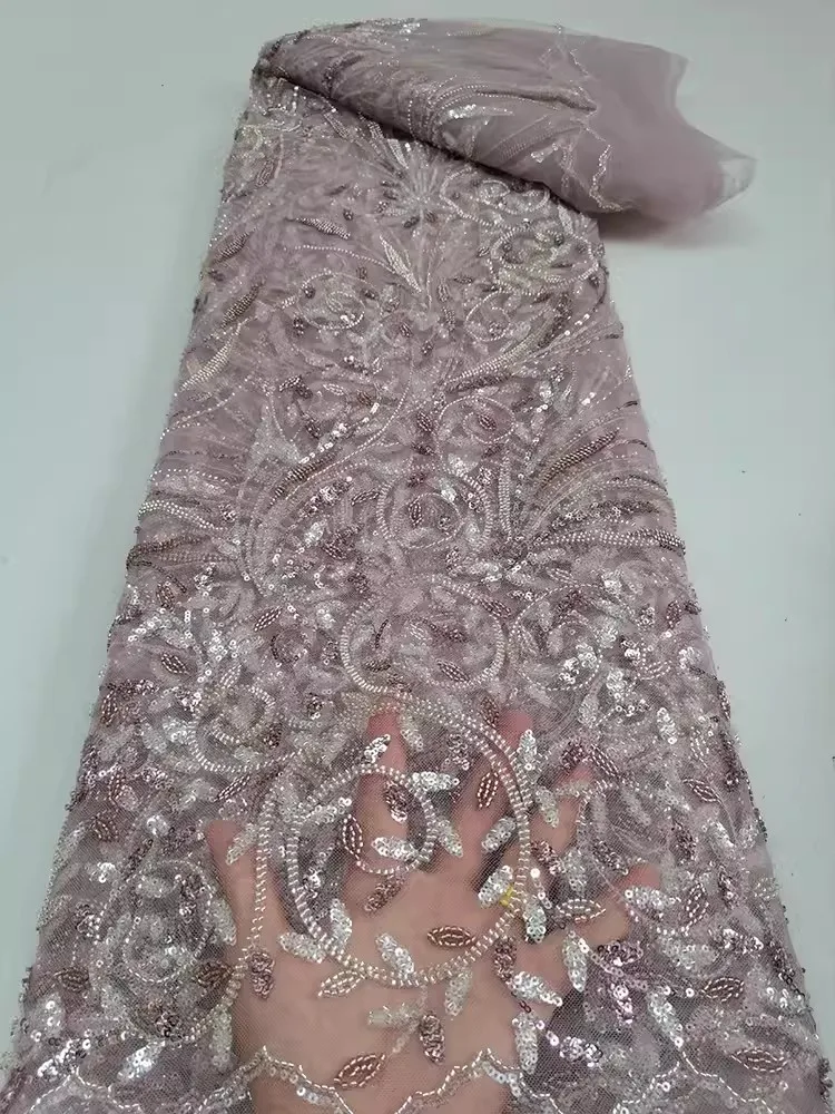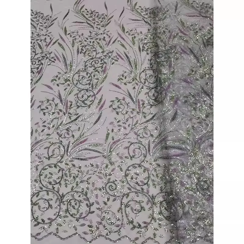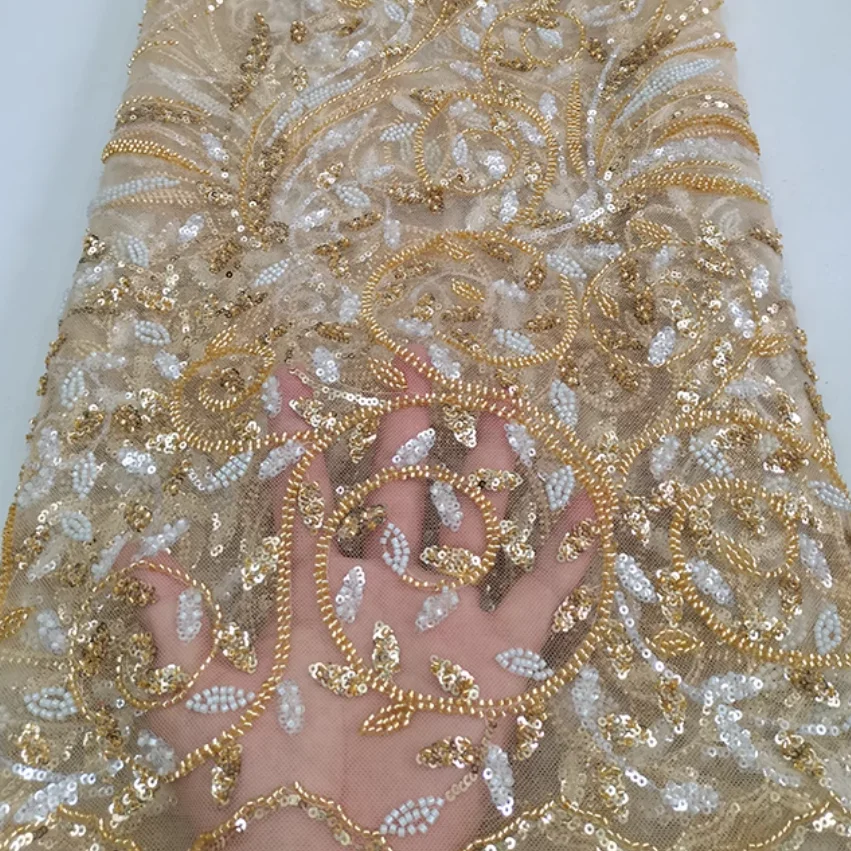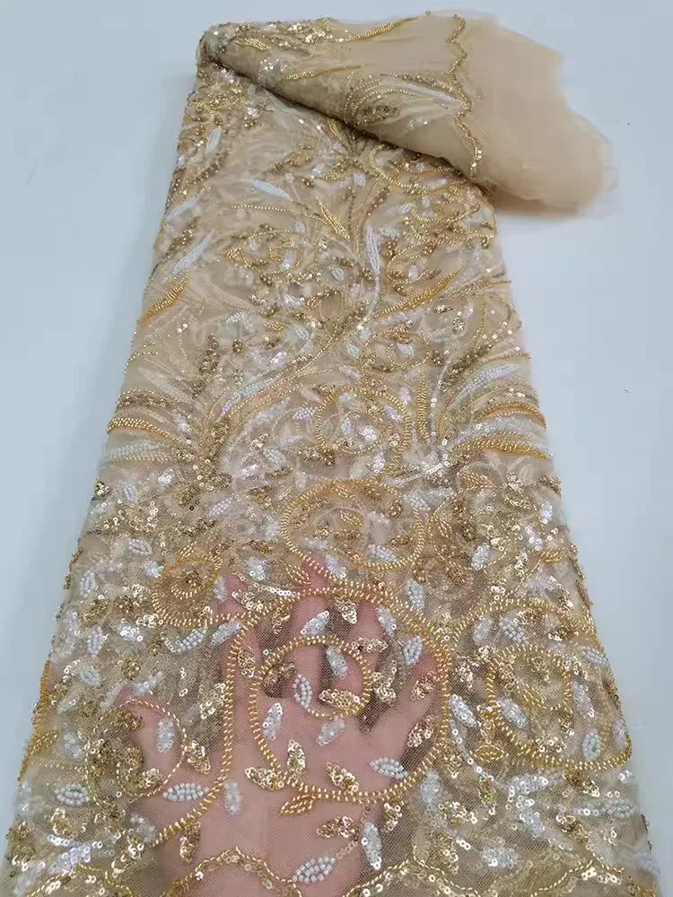 Width 125 cm Polyester Embroidered Tulle Mesh Fabric Gold Sequins Beads Fabric for Women Fashion Wedding Bridal Dress