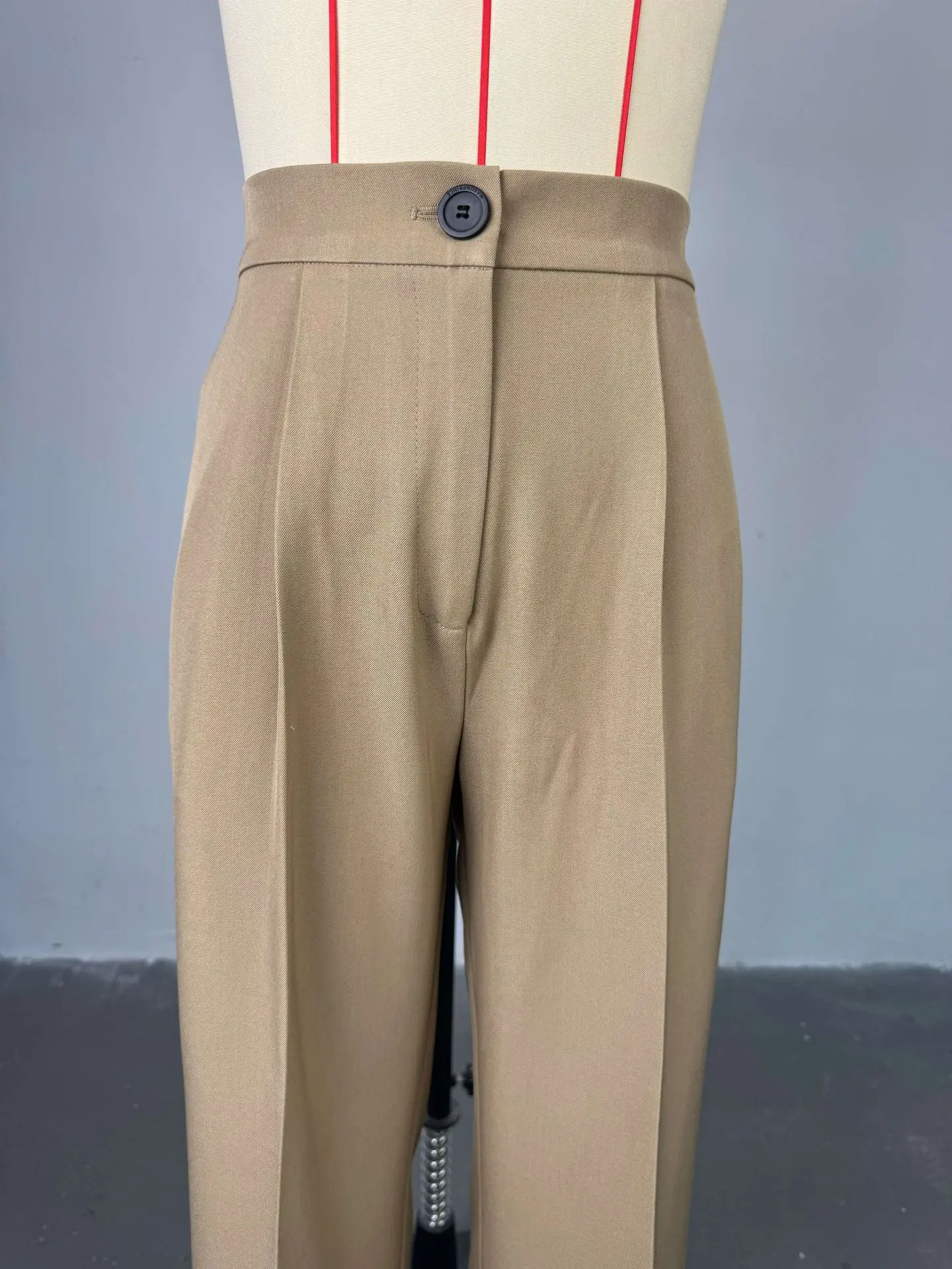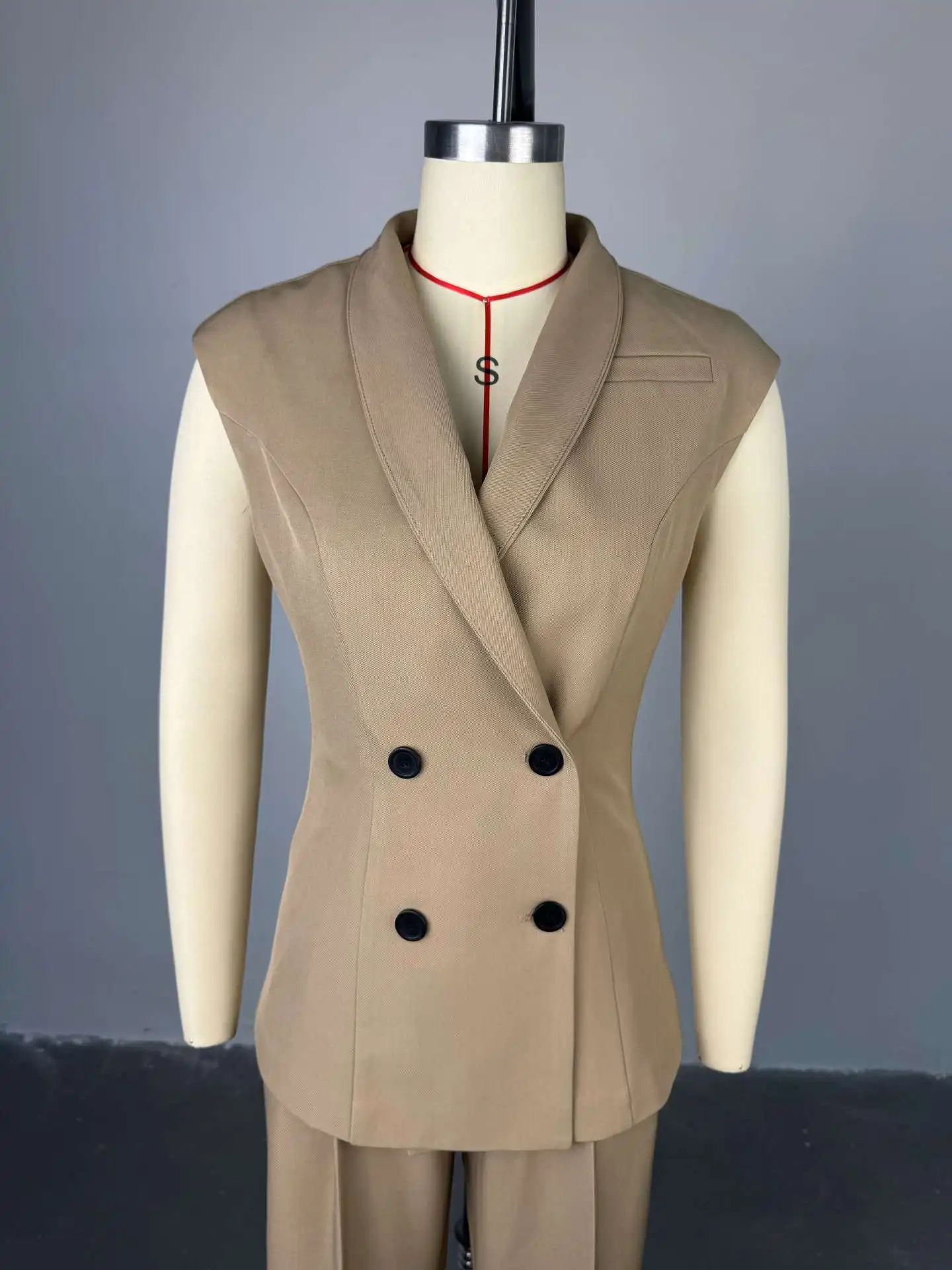 2025 Women Elegant Solid Jacket Pants Set Sleeveless Double Breasted Stand Collar Top Straight High Waist Trousers Women Suit