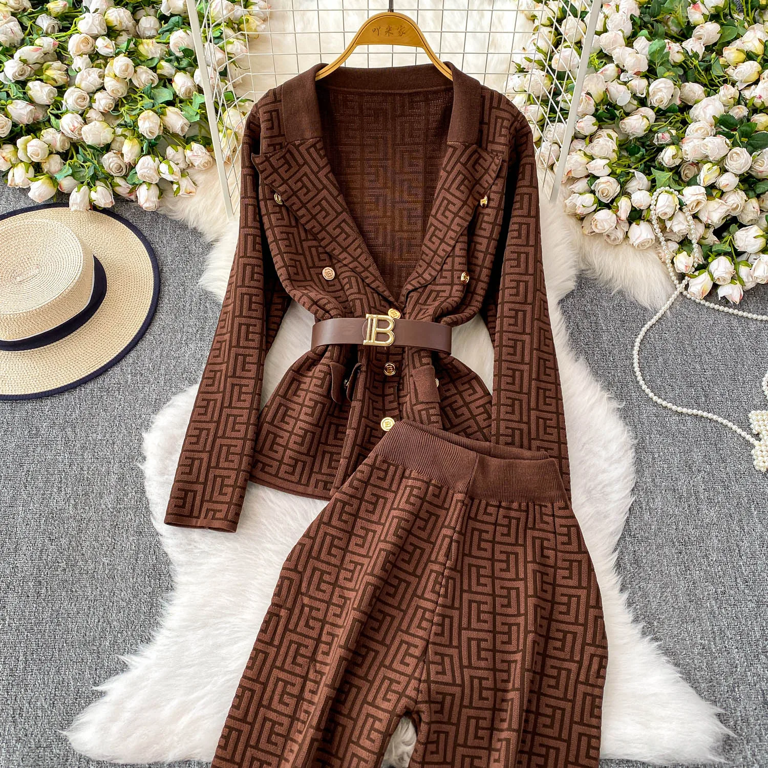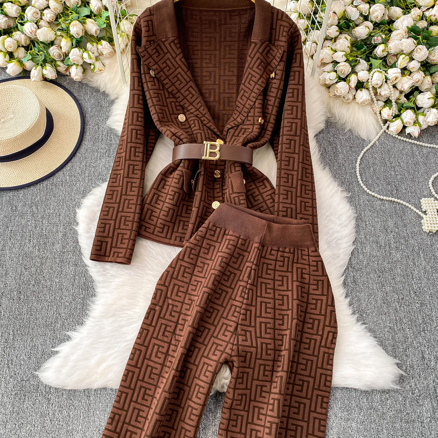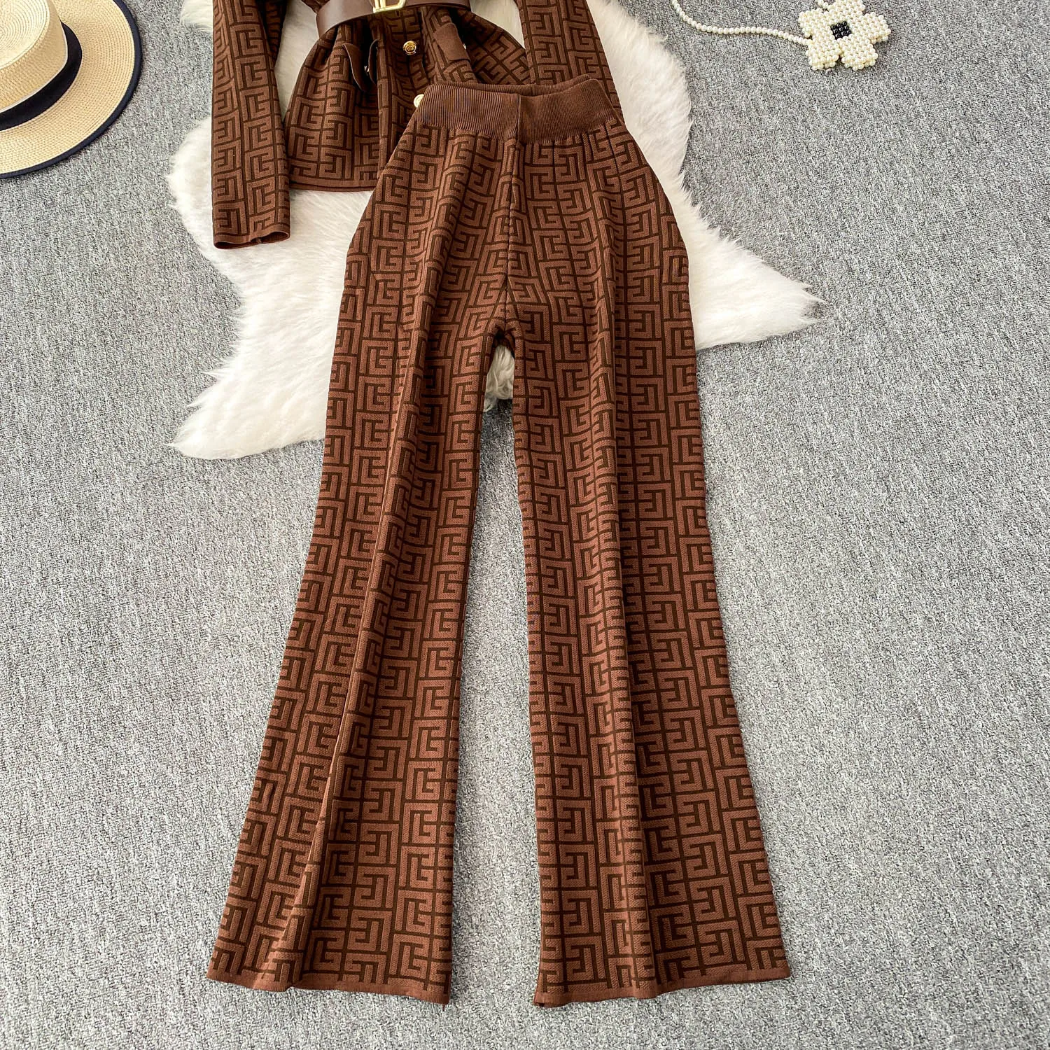 Elegant Two Piece Set Ladies Tie Waist Maze Print Notch Lapel Knit Jacket + High Waist Trousers Two Piece Sweat Suits
