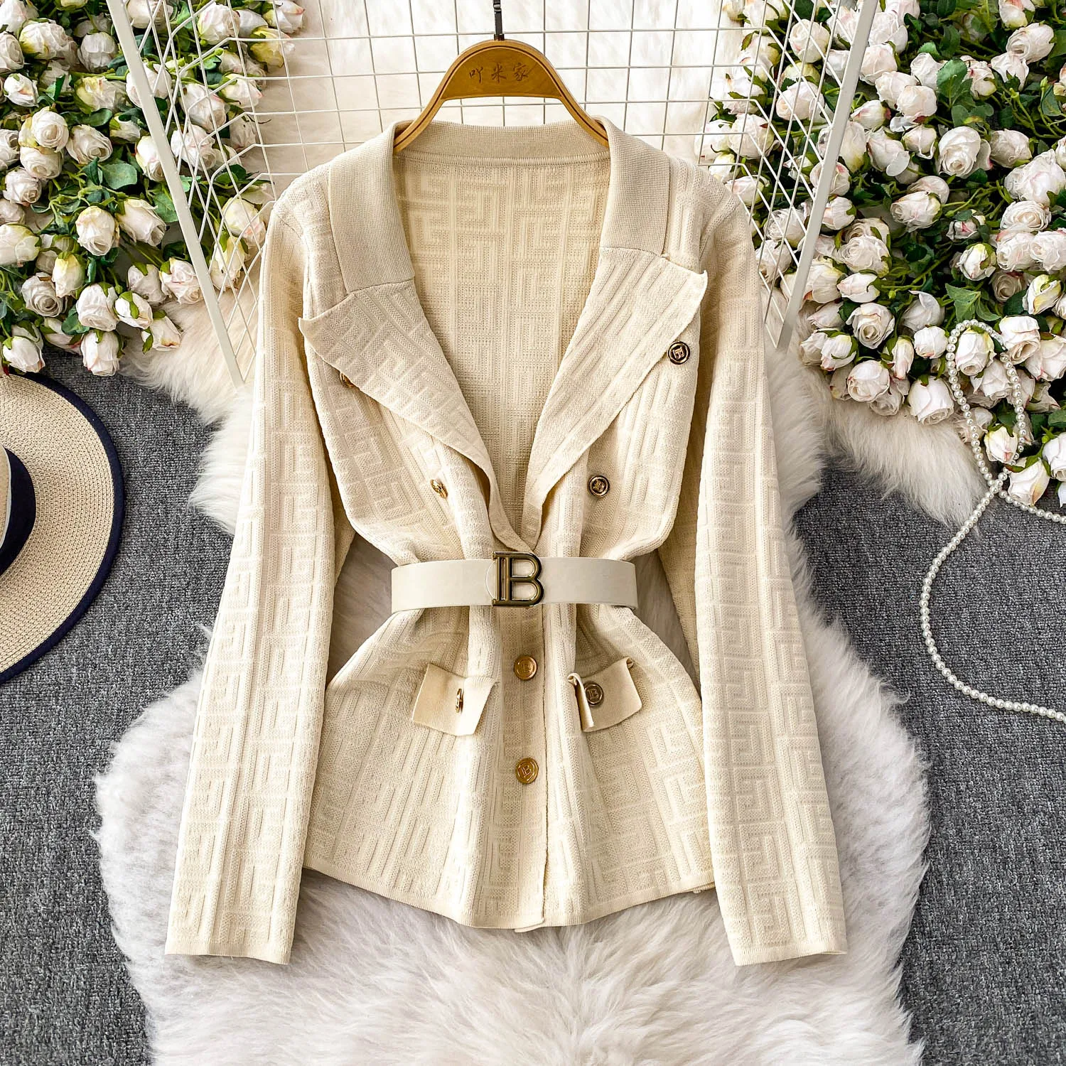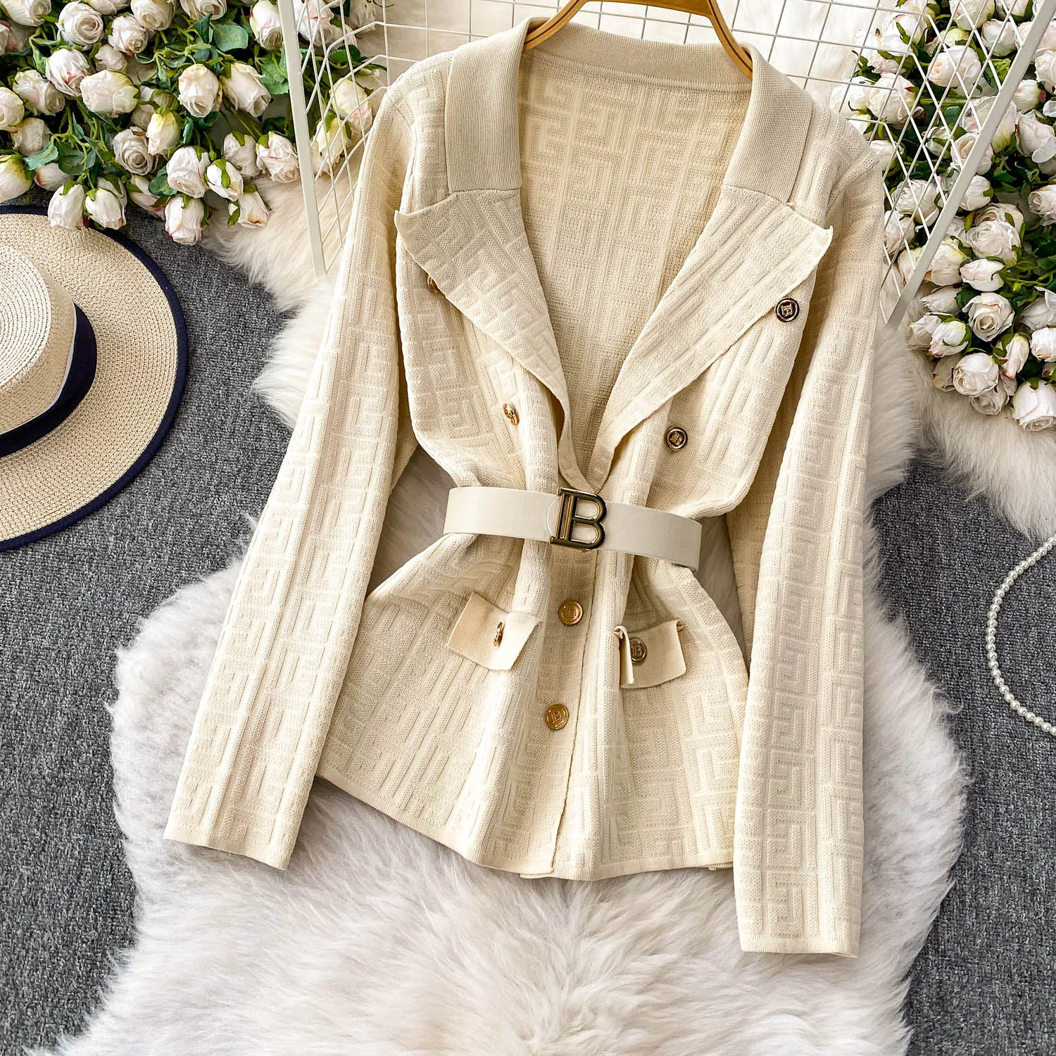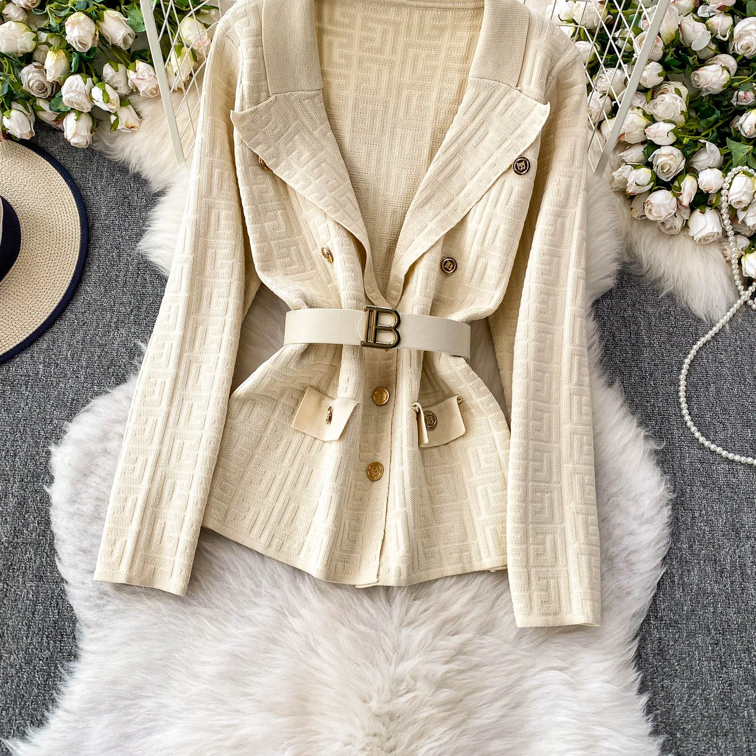 Elegant Two Piece Set Ladies Tie Waist Maze Print Notch Lapel Knit Jacket + High Waist Trousers Two Piece Sweat Suits
