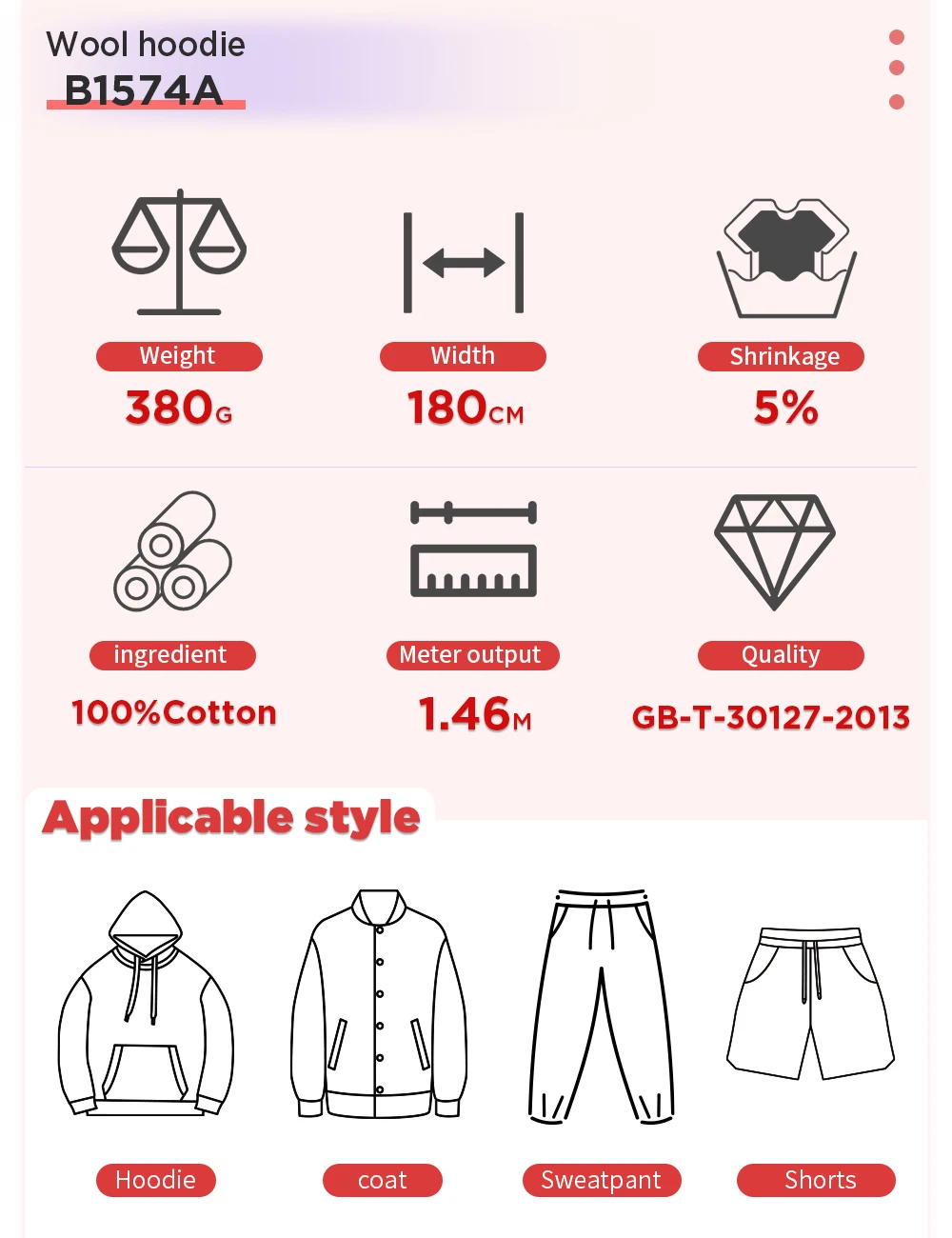 Applicable to: Sweatshirt, sweatpants, shorts, cardigan jacket