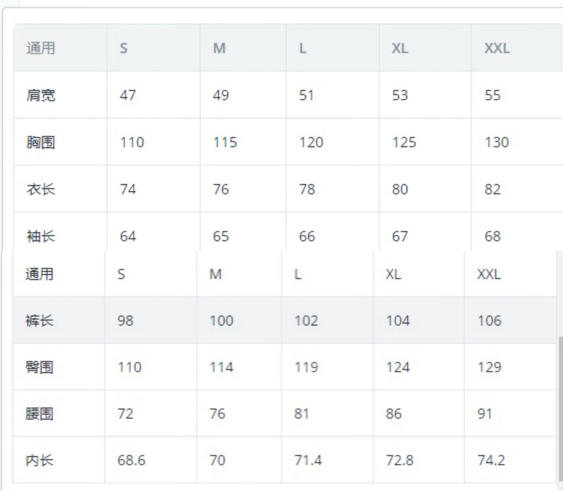 size_info: {"sizeInfoList":[{"length":{"cm":"47","inch":"18.50"},"size":"肩宽","vid":-1},{"length":{"cm":"110","inch":"43.31"},"size":"胸围","vid":-2},{"length":{"cm":"74","inch":"29.13"},"size":"衣长","vid":-3},{"length":{"cm":"64","inch":"25.20"},"size":"袖长","vid":-4},{"length":{"cm":"S","inch":"S"},"size":"通用","vid":-5},{"length":{"cm":"98","inch":"38.58"},"size":"裤长","vid":-16},{"length":{"cm":"110","inch":"43.31"},"size":"臀围","vid":-17},{"length":{"cm":"72","inch":"28.35"},"size":"腰围","vid":-18},{"length":{"cm":"68.6","inch":"27.01"},"size":"内长","vid":-19}]}