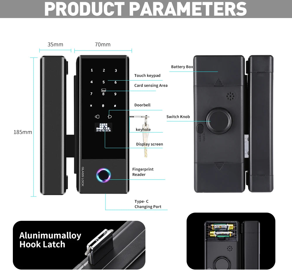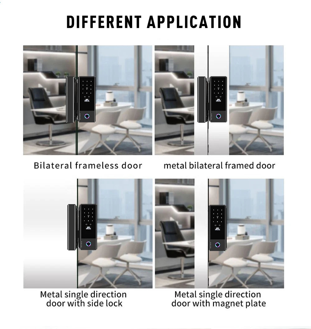 Multiple Unlocking Methods: Digital glass door lock has 4 kinds of unlocking methods, fingerprint, password, card and emergency mechanical key.