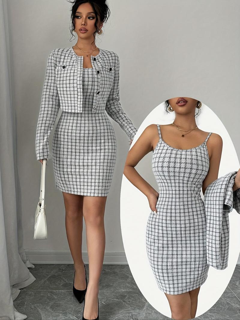 Women'S Jacket & Cami Dress Two-Piece Set, Casual Long Sleeve Outerwear & Dress for Work Office Business, Ladies Spring & Fall Clothes