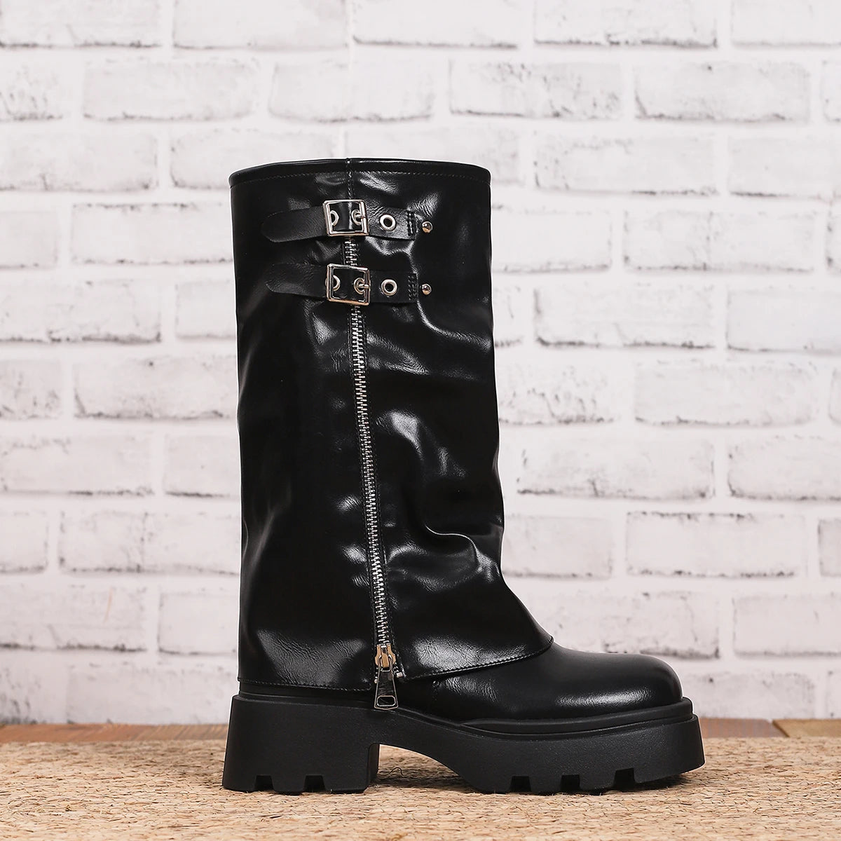 Women's New Fashion Long Boots with Round Toe Buckle and Thick Heel and Thick Sole European and American Style Boots